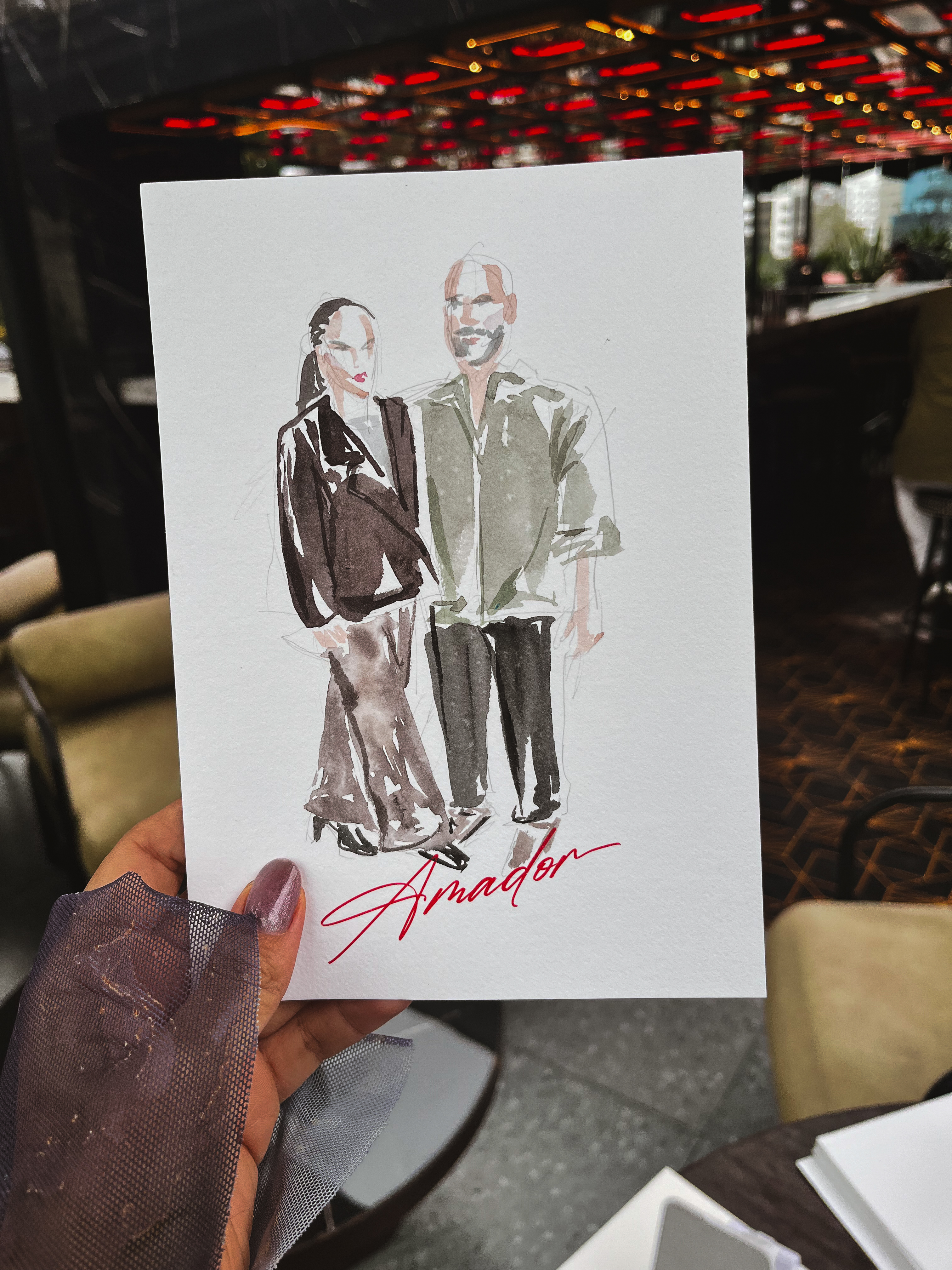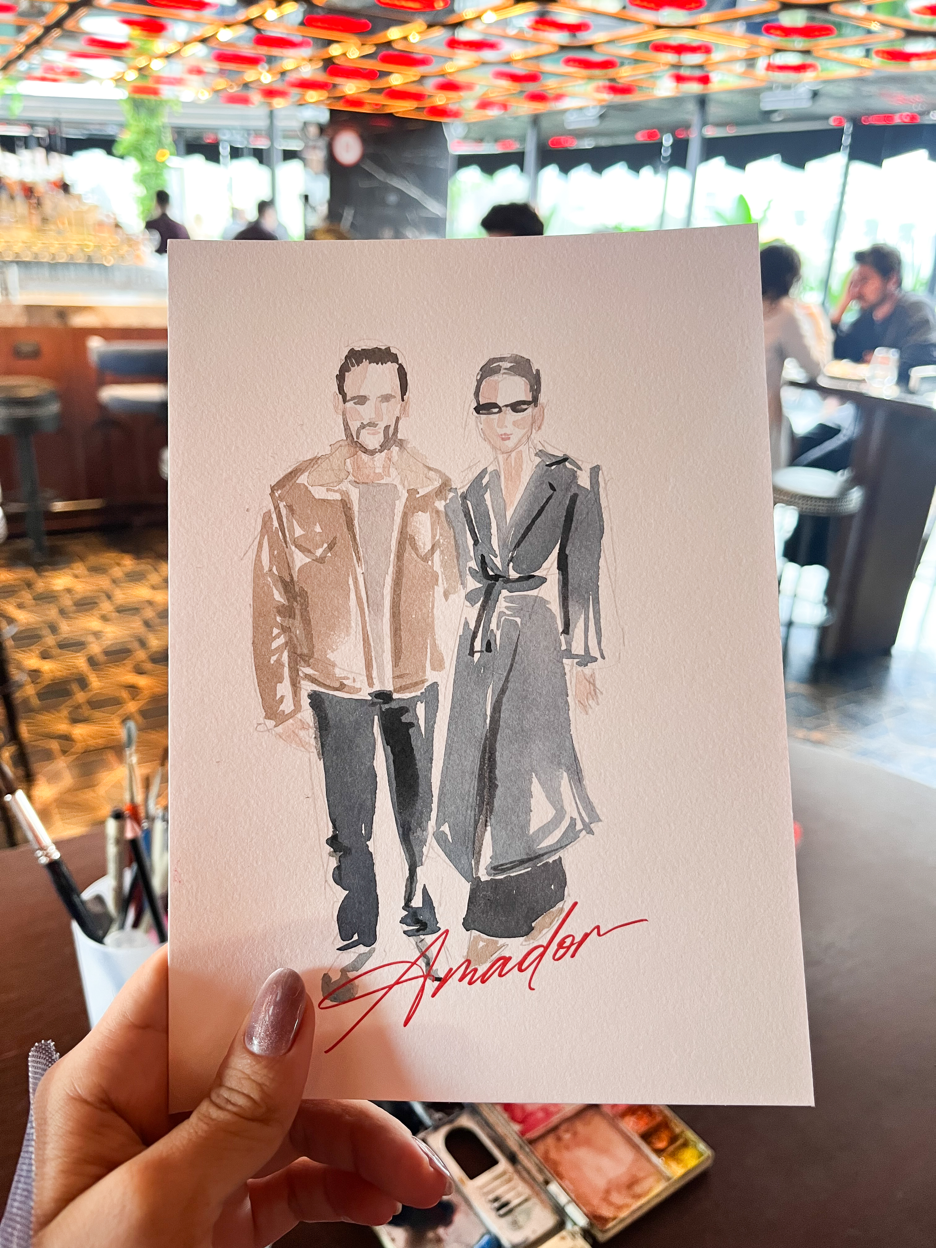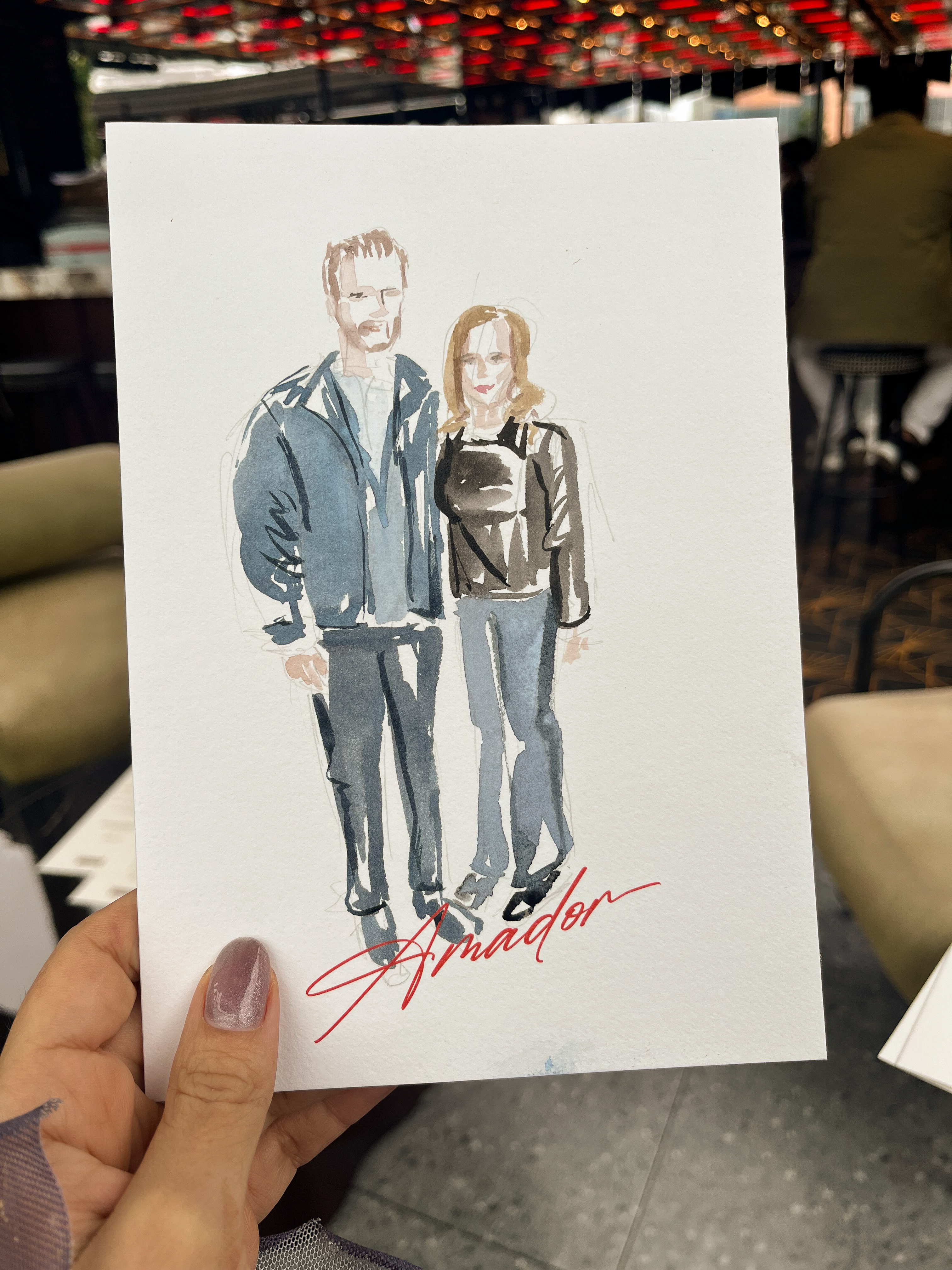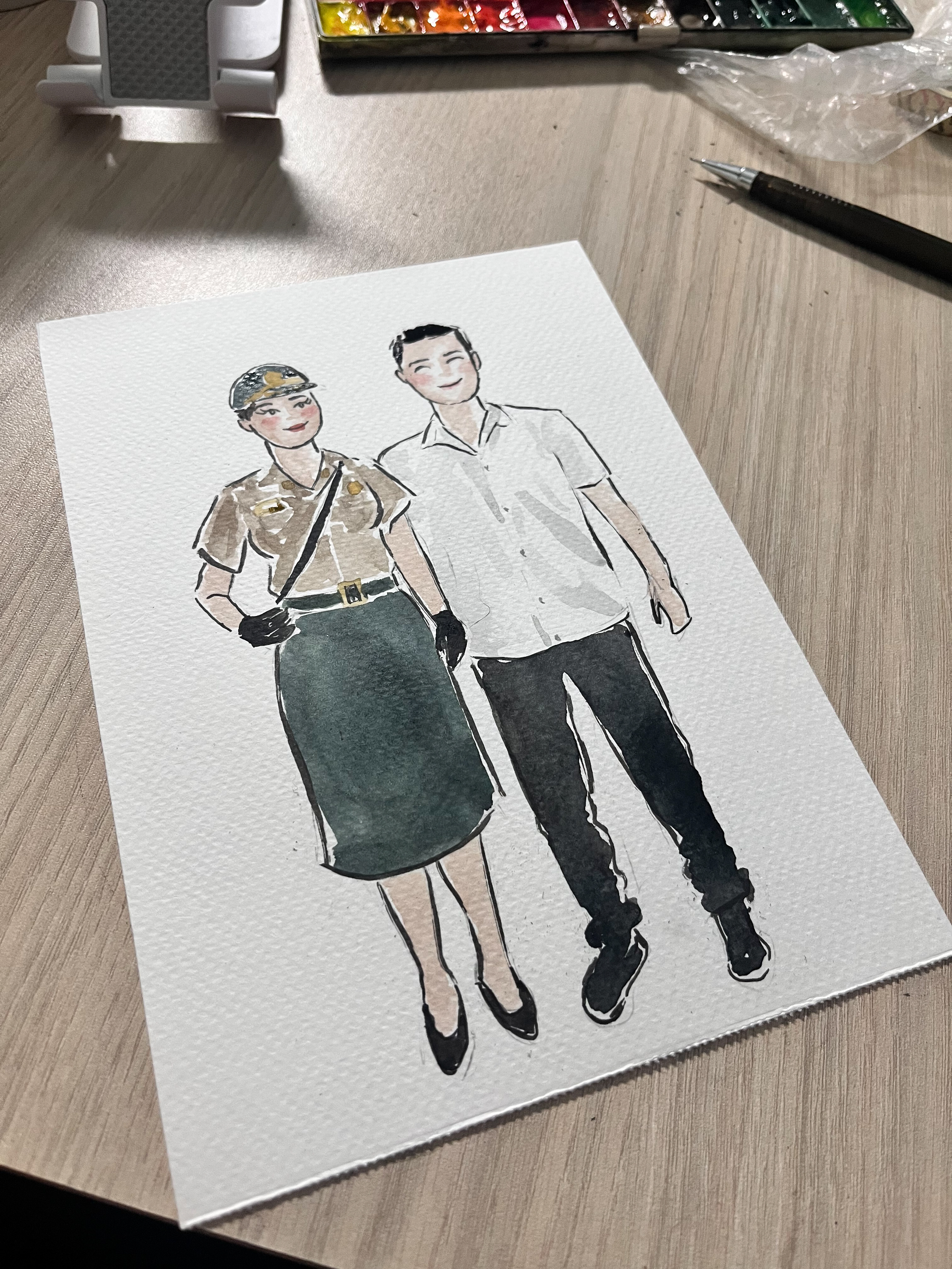 Pintaré retratos rápidos en formato A5 de cada pareja con acuarelas y tintas.